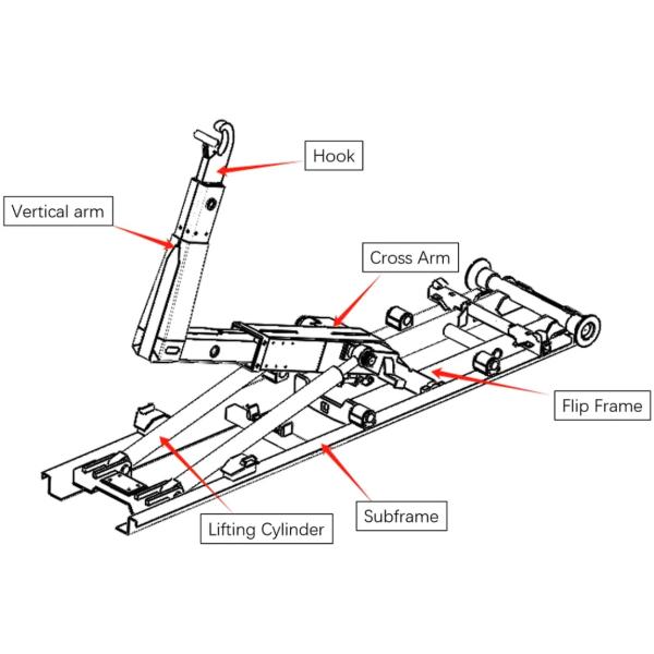 4. FlipFrame:The articulated pivot frame enabling the critical tilting action to dump contents once the container is raised vertically.